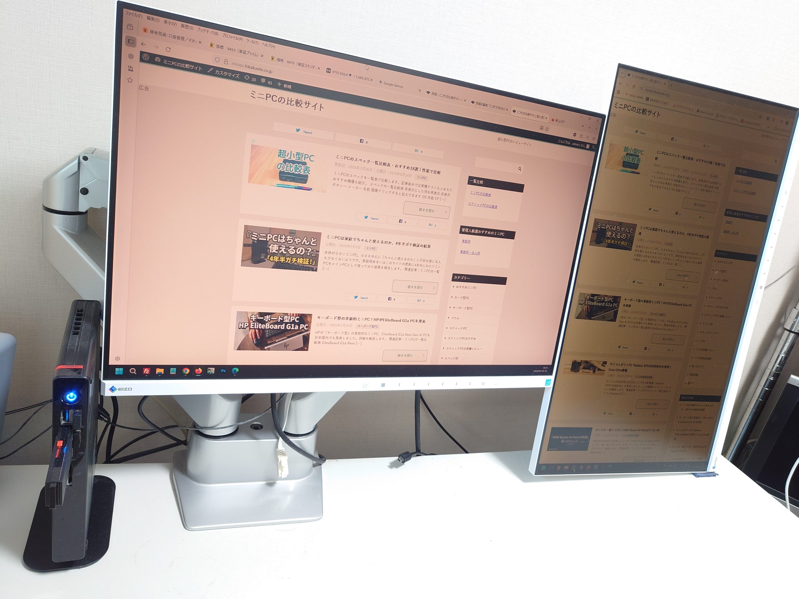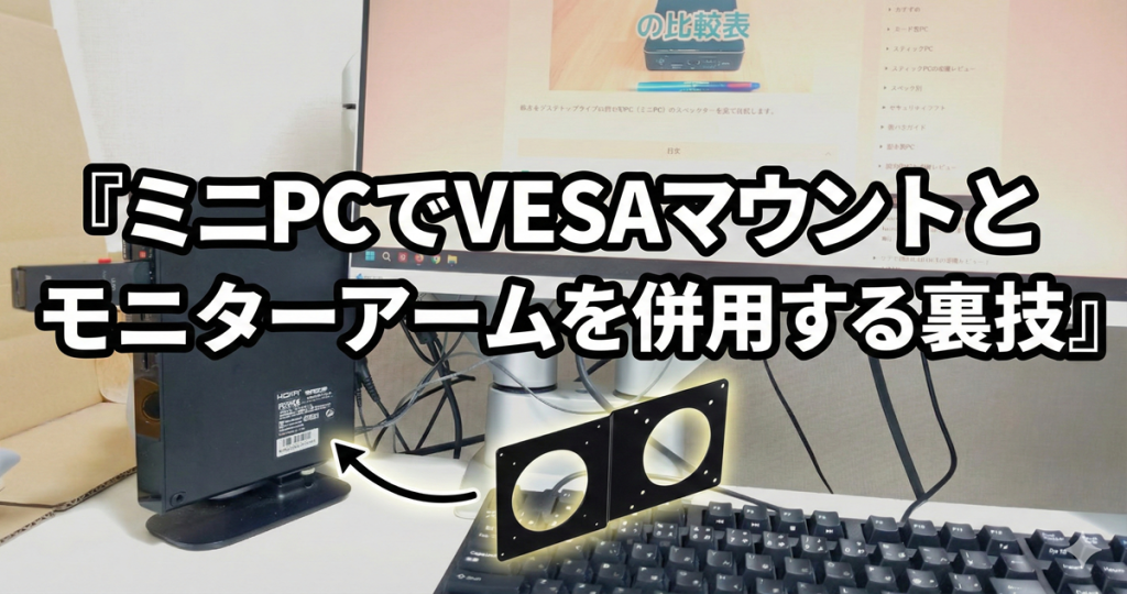 VESAマウントでモニター背面に取り付けできる利点があるミニPC。しかしモニターアームを使うとモニター背面に取り付けられない「問題点」があります。その解決方法をミニPC歴4年半の私が解説します。
